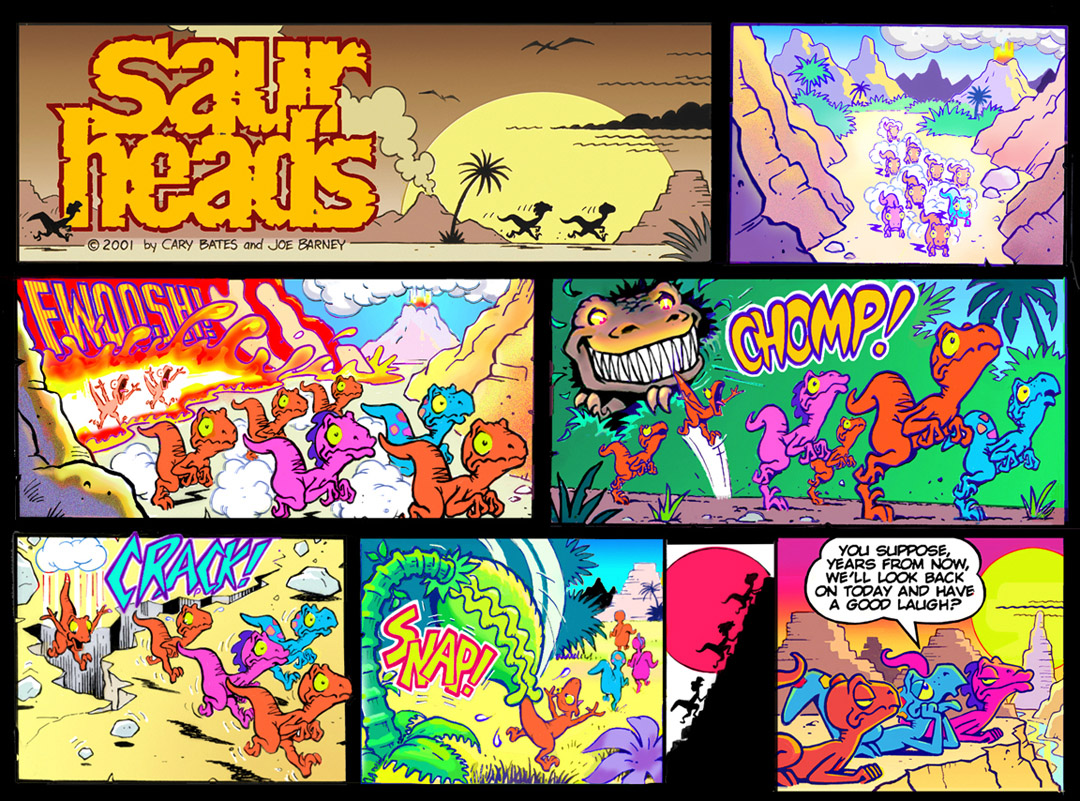 | SAURHEADS was a proposed newspaper strip featuring dark humor with dinosaurs createrd in the 80's with writer Cary Bates. Six weeks of sample strips, dailies and Sundays, were produced and submitted to syndicates. In this second Sunday, we killed off all our heroes' sibings, which may have been a bit too dark for the conservative newspaper strip medium at the time... |